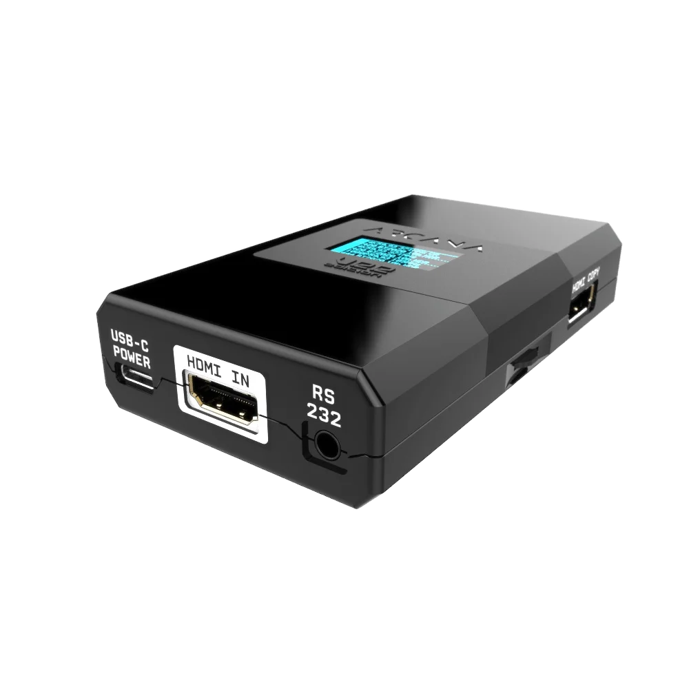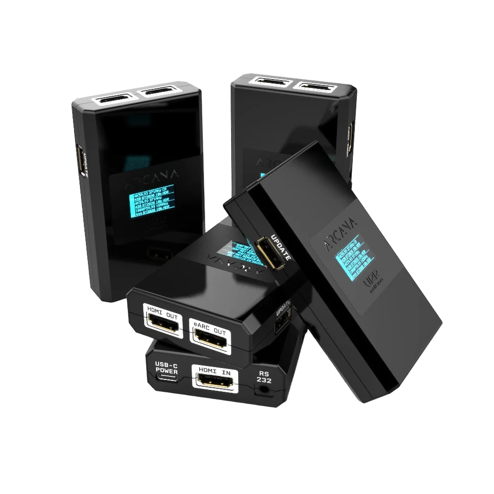 Qua hardware beschikt de 8K Arcana 2 VRR over 1 HDMI-ingang, 2 HDMI-uitgangen met schaalbaarheidsoptie, 1 eARC-uitgang, USB type A voor updates via een USB-stick, USB type C voor stroomvoorziening, RS232, een OLED-scherm en een draai-/wielschakelaar aan de zijkant waarmee u in het systeemmenu van het apparaat kunt navigeren, items kunt selecteren en wijzigingen kunt aanbrengen. De 8K Arcana VRR- ingang is geschikt voor 4K en 8K VRR/HDR/HLG/DV/LLDV/HDR10+ tot FRL5/40 Gbps/1200 MHz voor video en ondersteunt alle huidige geluidsformaten. De HDMI TX0- en HDMI COPY-video-uitgangen kunnen FRL5/VRR/40 Gbps/1200 MHz of upscaling/downscaling en alle geluidsformaten uitvoeren. 8K Arcana VRR draait in een standaard Splitter/Pass-thru/Upscaler- of Downscaler-modus, zodat uw installatie optimaal blijft presteren.